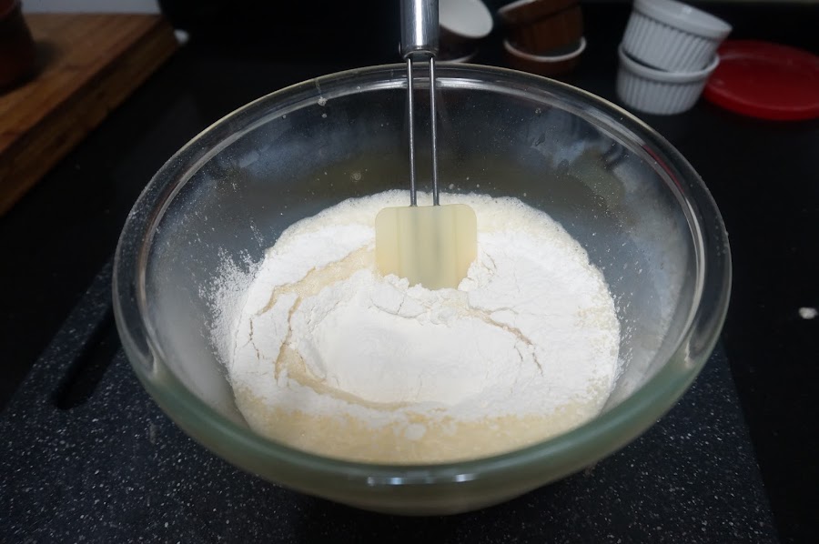 Le echamos la harina tamizada y mezclamos poco a poco.
