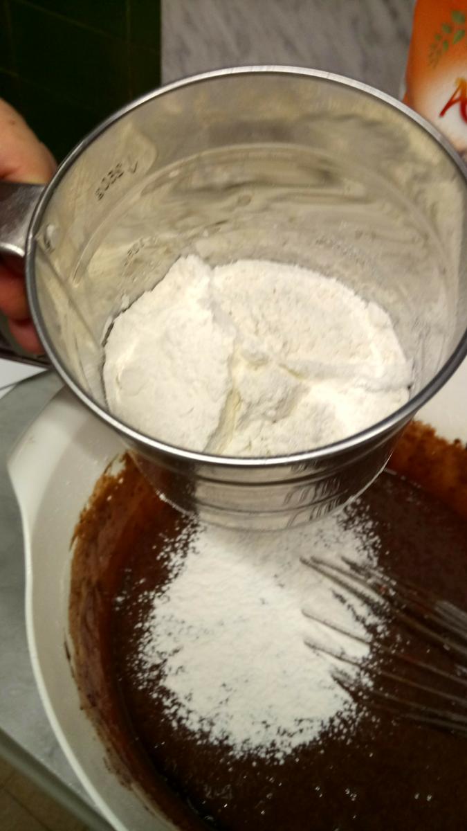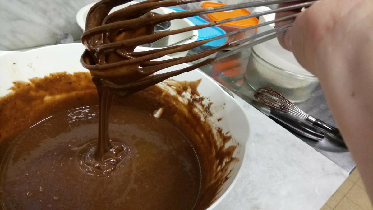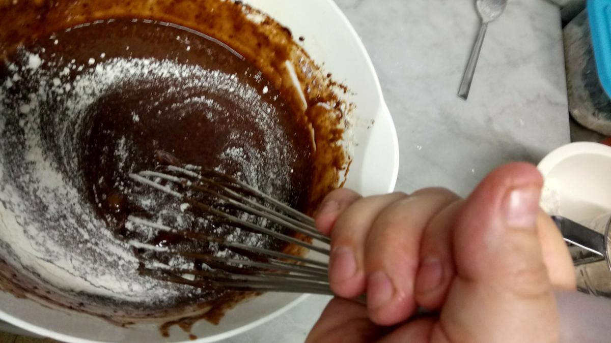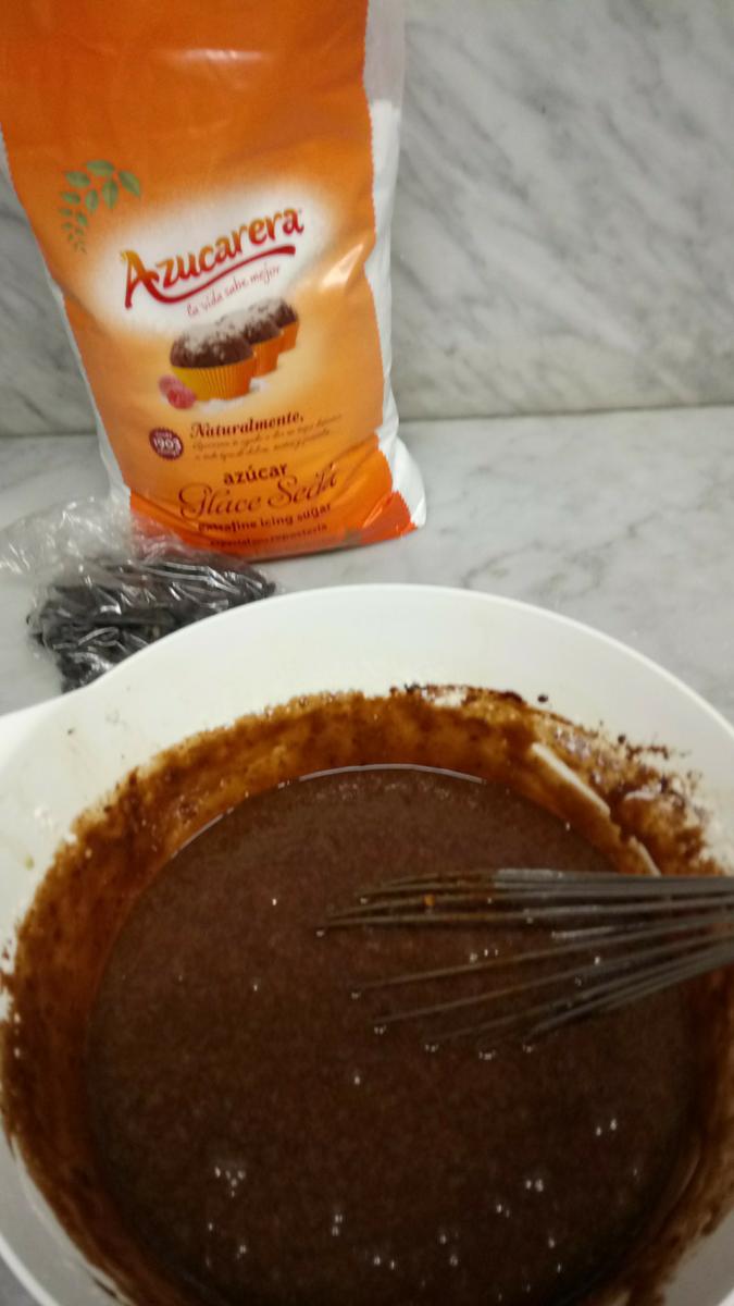 Mezclamos al chocolate deshecho la mantequilla, la vamos incorporando a la mezcla, los huevos, el azúcar glas y por último la harina tamizada.