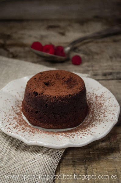 Sacar del horno, dejar entibiar ligeramente antes de desmoldar!! Espolvoreamos con cacao puro en polvo y frambuesas frescas. También se puede presentar con una bola de helado de vainilla, natillas o crema inglesa....