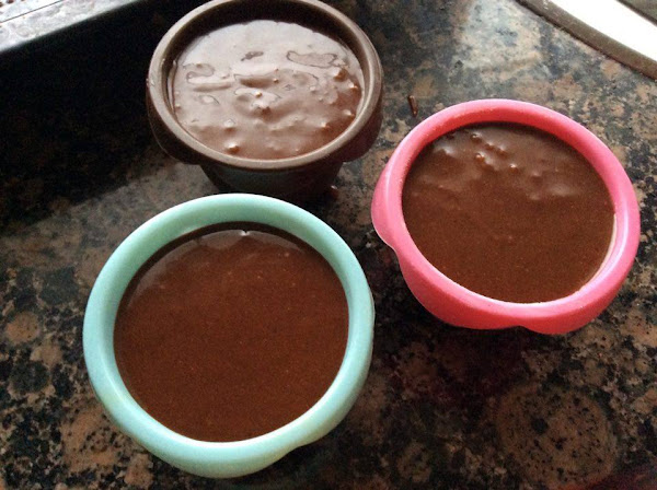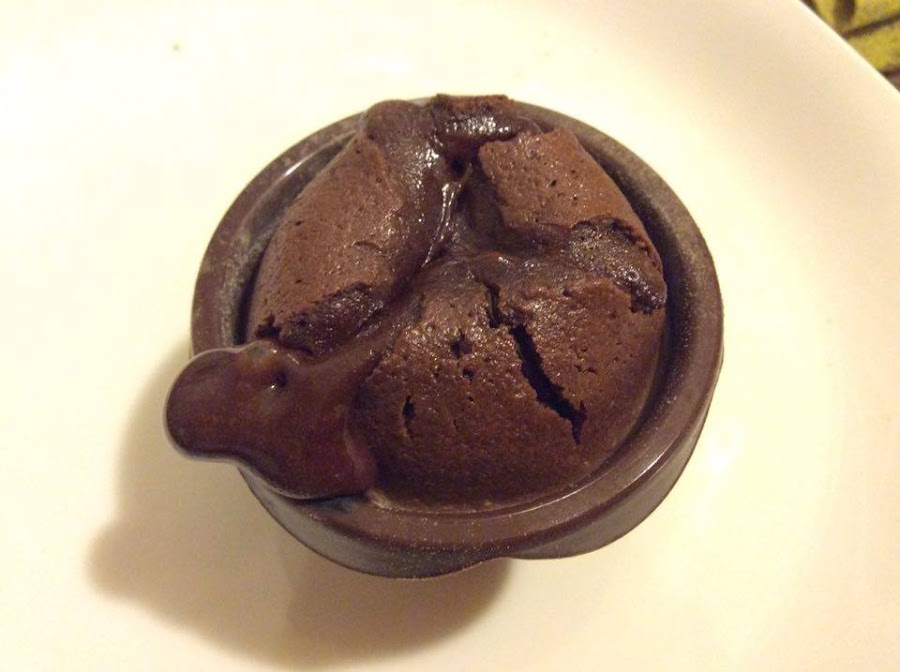 Cuando los vayamos a comer, precalentar el horno a 180 ºC, introducir los coulants destapados durante aproximadamente 16 minutos. La cocción perfecta depende mucho del horno y del molde que se utilice. Lo que yo he hecho ha sido cocinar uno sólo para probar. Lo puse 16 minutos y quedó perfecto, si no es ese vuestro caso, probad con un minuto más o uno menos.