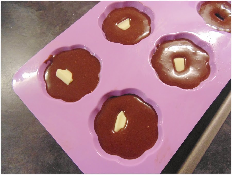 Vertemos en el molde y agregamos una onza de chocolate blanco en cada coulant