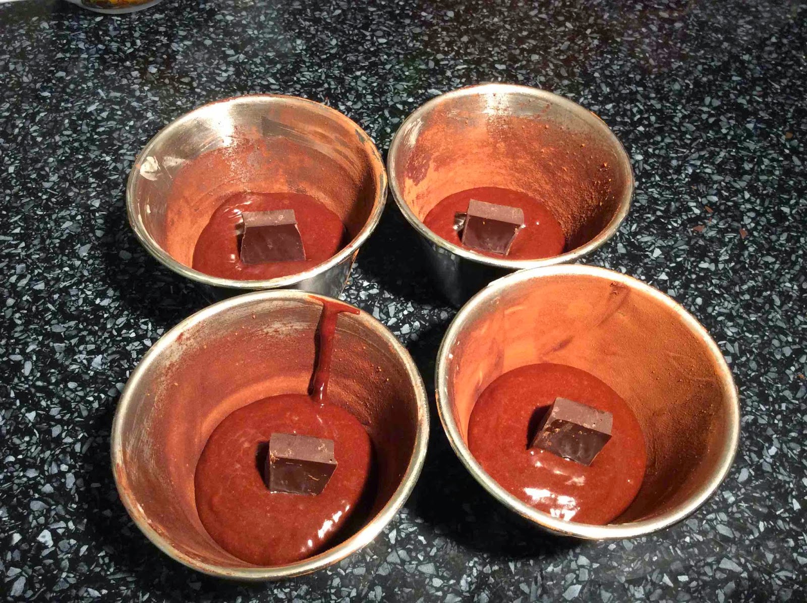 5: Ponemos un trozo de chocolate para postres en cada molde y cubrimos con el resto de la mezcla.