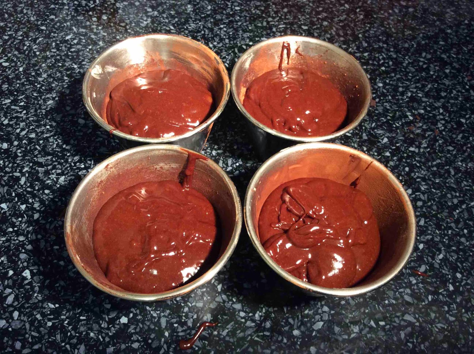 4: Encamisamos los moldes con mantequilla y cacao y vertimos la mezcla hasta 1/3 del molde.