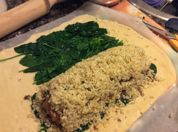 Después, pondremos otra capa de arroz y otra de hojas de espinaca, esta última podemos ponerla sobre la masa.