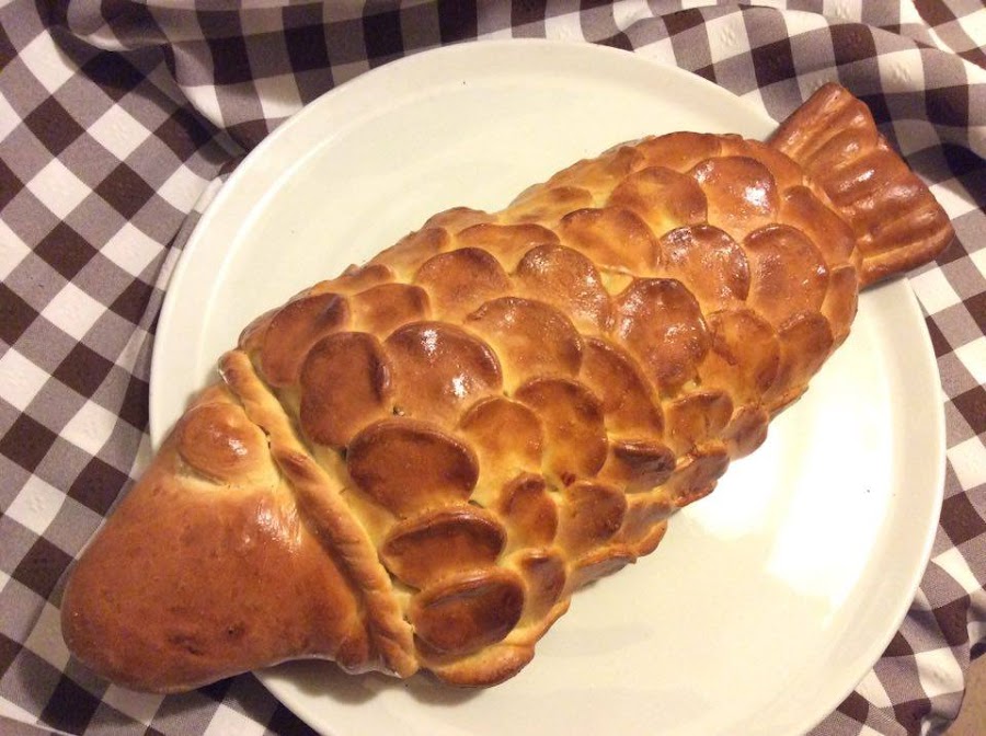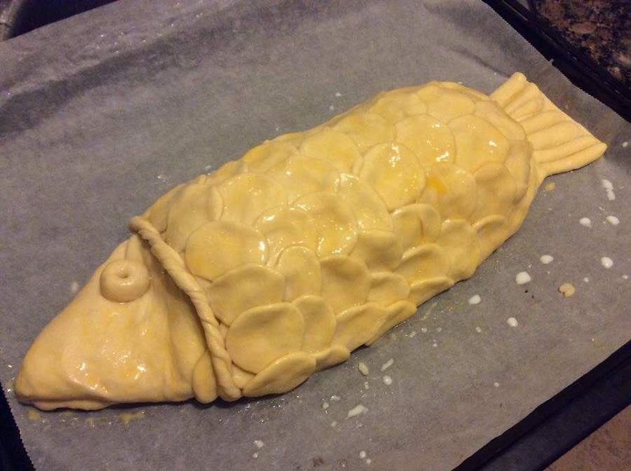 Cuando esté todo cubierto, podemos hacer una tira de masa y enroscarla sobre si misma para marcar con ella el inicio de la cabeza del pez.