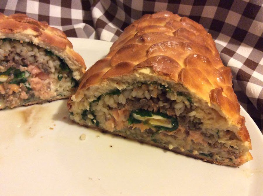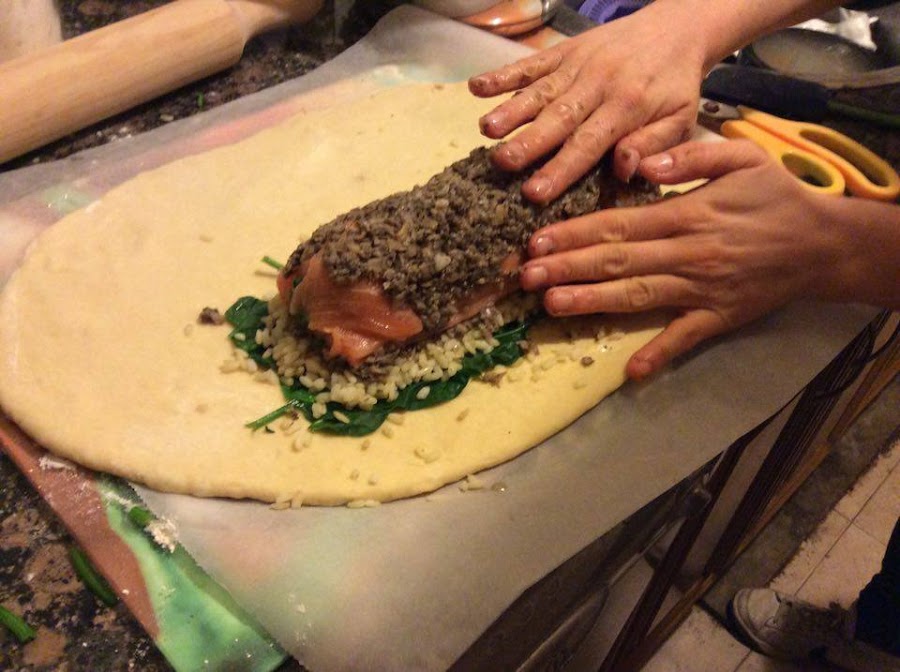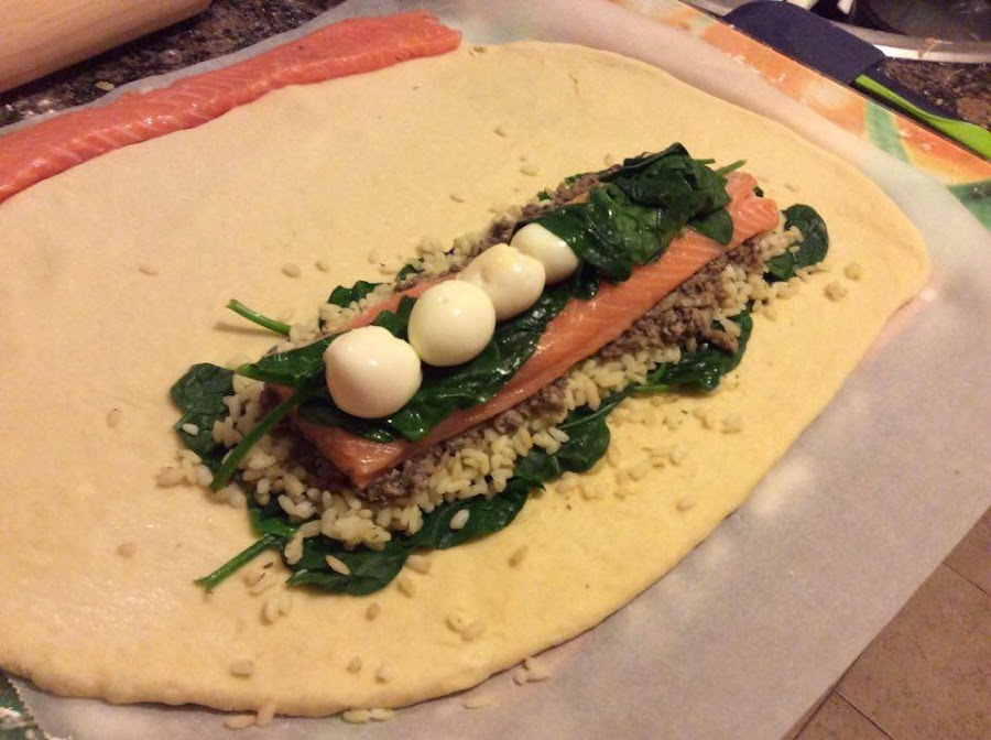 Transcurrido el tiempo de reposo de la masa, vamos a montar el coulibiac. Para ello tomamos algo más de la mitad de la masa y estiramos hasta que calculemos un tamaño por lo menos cuatro veces el pedazo de salmón, aproximadamente.