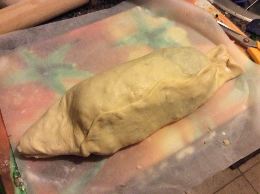 Finalmente, doblamos la masa para hacer un paquete, untando primero el lado largo de la masa.