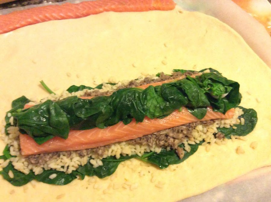 Ahora lo que tenemos que hacer es cubrir una parte de la masa con espinacas (estirando las hojas) un trozo algo más grande que el pedazo de salmón.