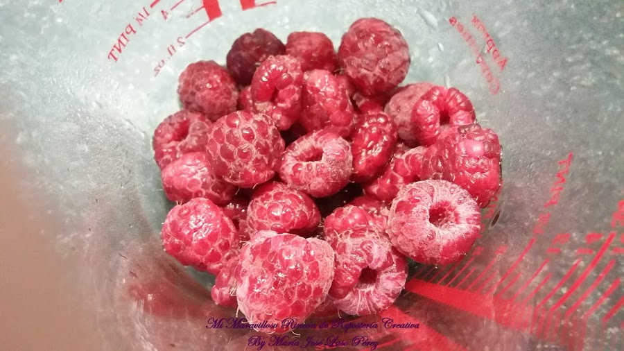 Lavamos bien la fruta y la escurrimos. Secamos las frambuesas con papel absorbente. Las ponemos en el vaso de la batidora, añadimos la cucharadita de zumo de limón y reservamos.