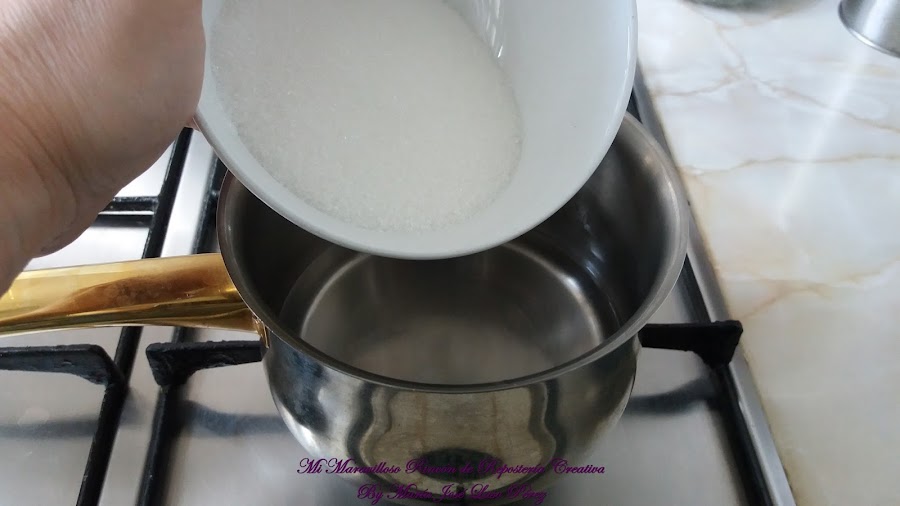 Ponemos en un cazo el agua y el azúcar y dejamos que hierva.