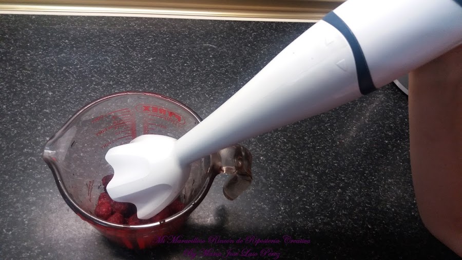 Añadimos el almíbar caliente a las frambuesas que habíamos reservado antes. ¡Tener cuidado de no quemaros con el almíbar! Y lo trituramos todo con la batidora. Obtenemos un puré.