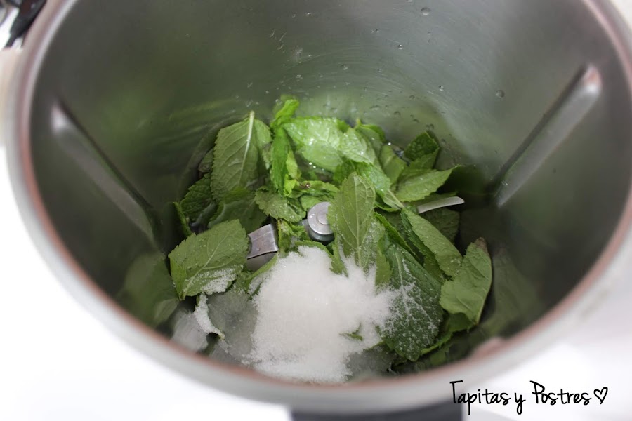 Ponemos el agua, las hojas de hierbabuena y el azúcar en el vaso de la thermomix y programamos 10 minutos, varoma y velocidad 2. Luego dejamos enfriar para que baje la temperatura y trituramos 10 segundos a velocidad 8-10. Bajamos los estos y volvemos a triturar otros diez segundos a velocidad 8-10.