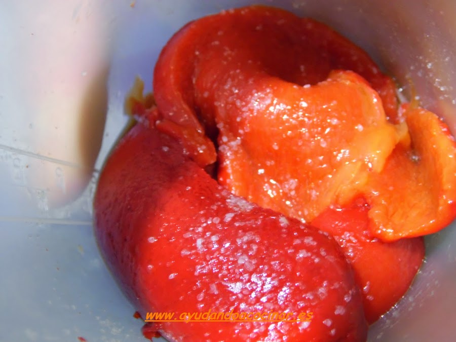 introducirlo en el vaso de la batidora junto con la cebolla, la sal , la mezcla de pimientas y el aceite de oliva virgen extra.