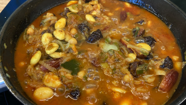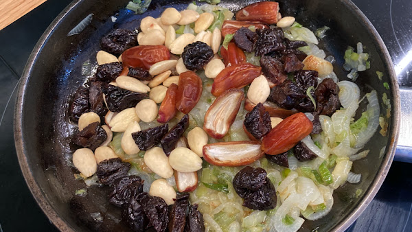 Introduce dátiles, ciruelas y almendras en la sartén de la cebolla (que seguirá a fuego medio) y añade a esta sartén caldo y garbanzos. A esta preparación no le debe faltar nunca caldo durante unos 20-30 minutos. Sírvelo en una salsera.