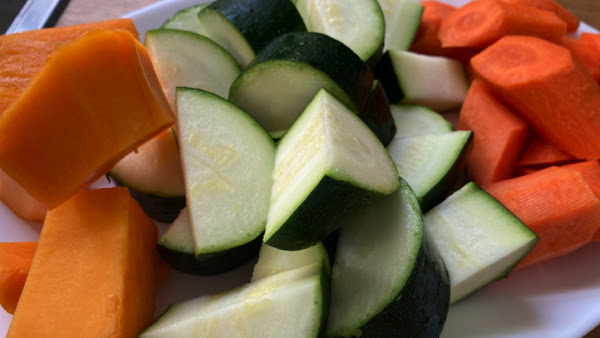 Pela la calabaza y córtala en trozos grandes. Yo la compré ya pelada y troceada.