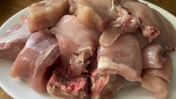 Limpia y trocea el pollo. Yo le he quitado la piel. Esto te lo pueden hacer en la carnicería.