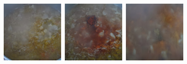 Mientras tanto, picamos las verduras; cebolla y zanahoria en trozos pequeños y el tomate que previamente habremos pelado.