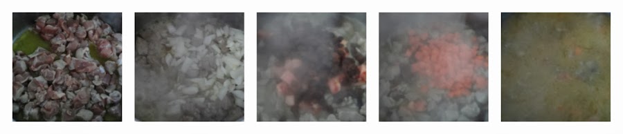 Comenzamos troceando el cordero en trozos menudos y lo doramos en una cazuela con 3/4 cucharadas de aceite.