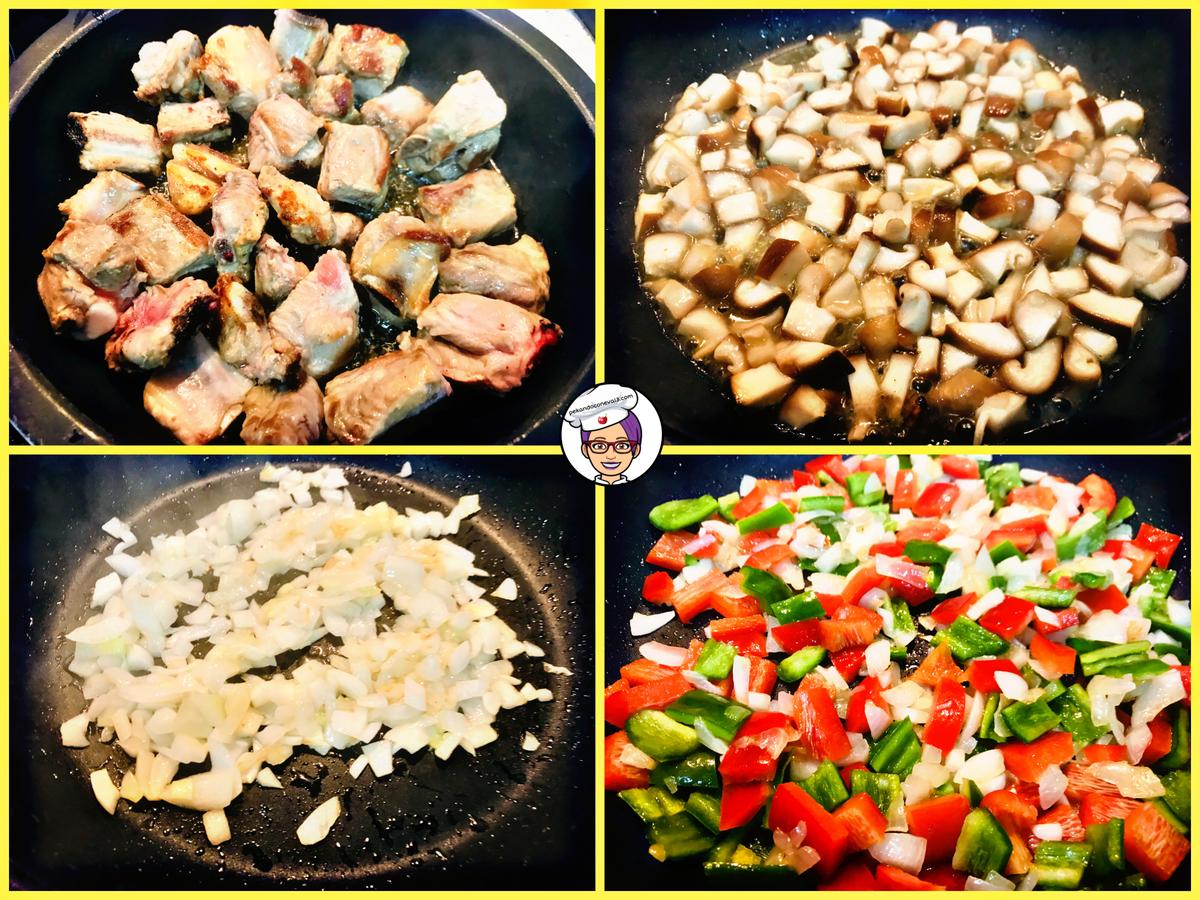 una vez esté listo se introduce en la cazuela las setas y las costillas, moviéndolo para que se reparta bien.
