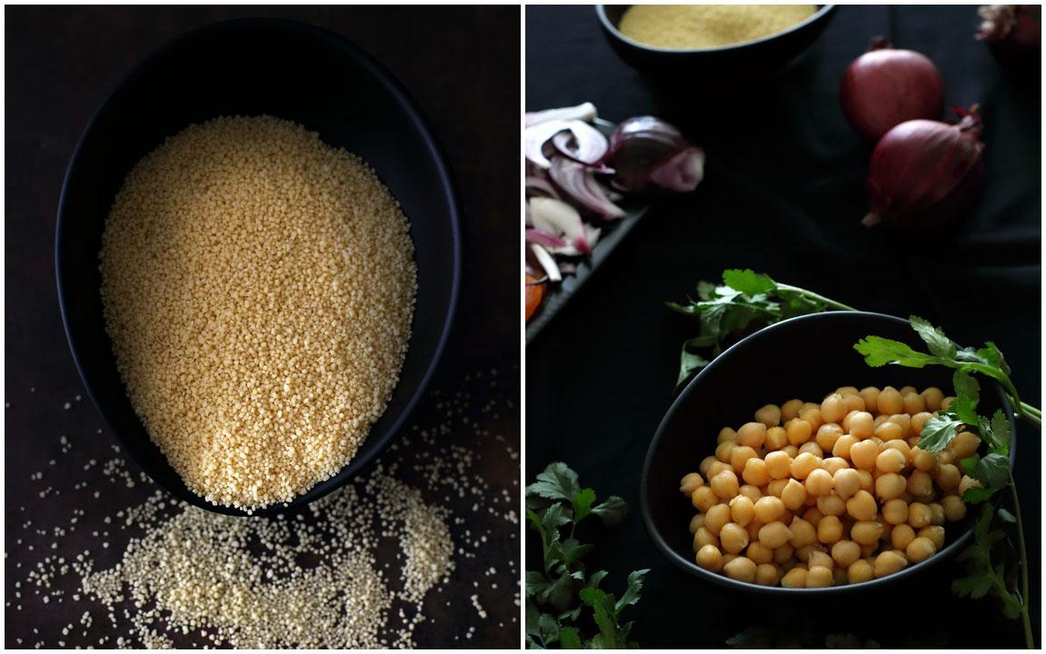 Para preparar el cous cous: llevamos el agua a ebullición. Cuando hierva la retiramos del fuego, incorporamos el cous cous y lo dejamos tapado hasta que absorba el agua. Añadimos la mantequilla y lo removemos bien