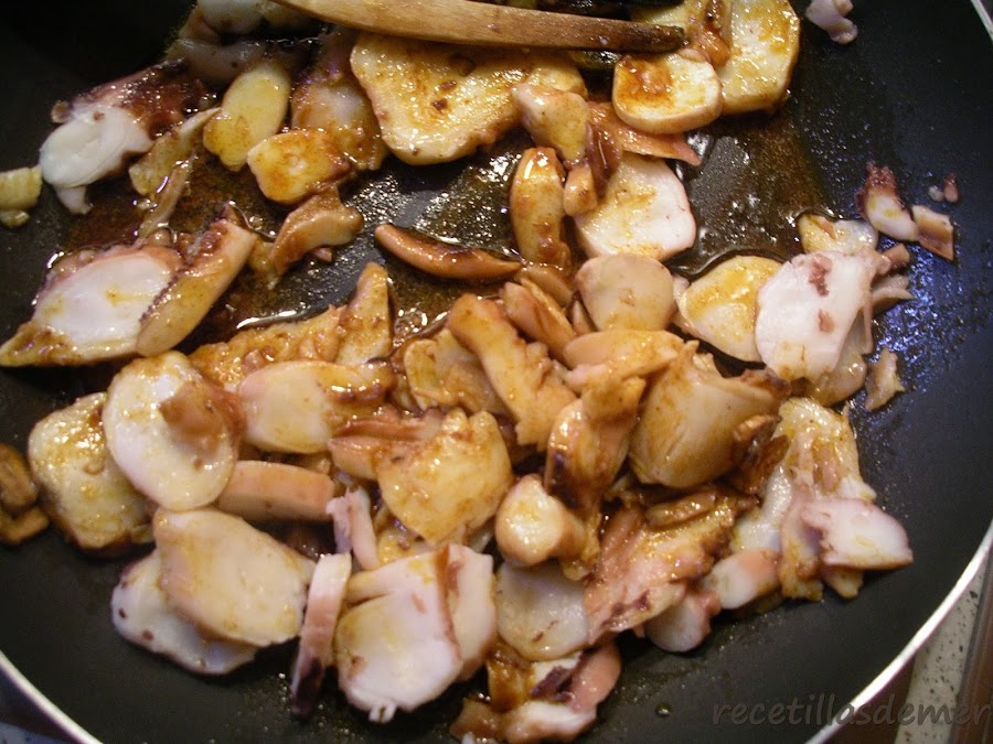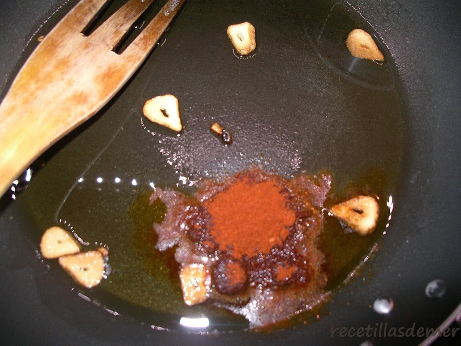 Y por otro lado, en una sarten, freir el diente de ajo cortado en láminas. Cuando coja un poco de color, y antes de que se queme, retirar del fuego y añadir la cucharada de pimentón y el rejo en rodajas descongelado.