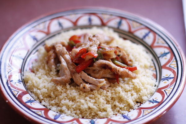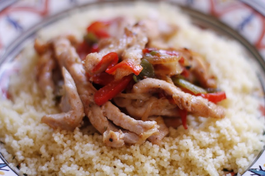 En el plato ponemos el Cous-cous y encima el salteado de verduras y pollo