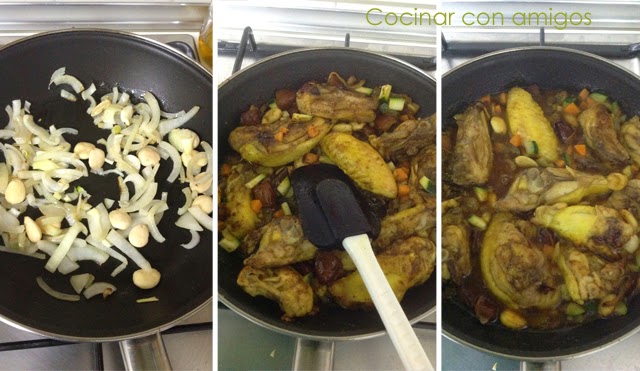 Salamos la cebolla y cocinamos junto a las almendras en una sartén con un chorrito de aceite de oliva. Pasados 2 minutos añadimos el pollo salpimentado, los dátiles troceados y el resto de verduras, con las especias Ras el hanut, cocinamos durante 5-7 minutos a fuego suave.