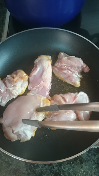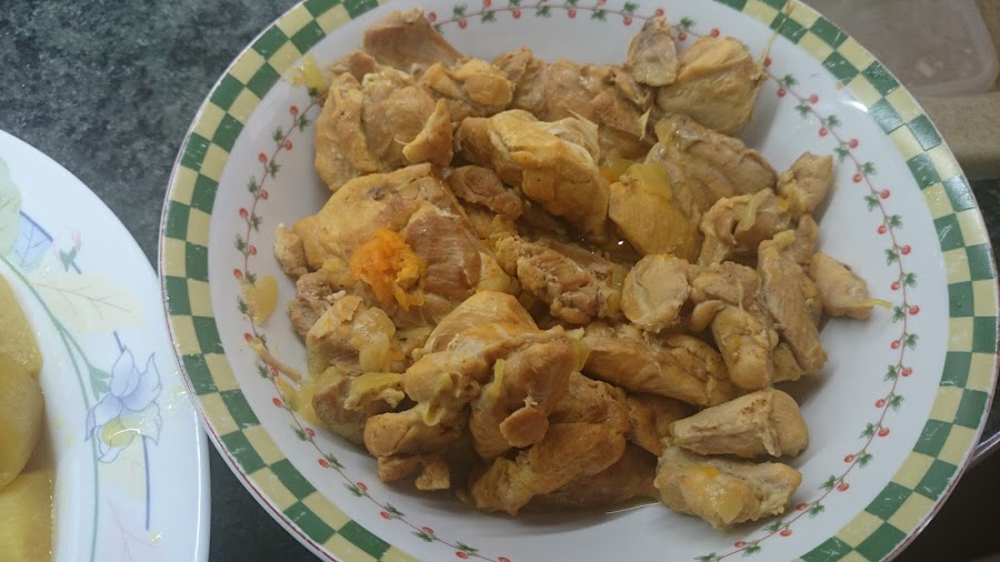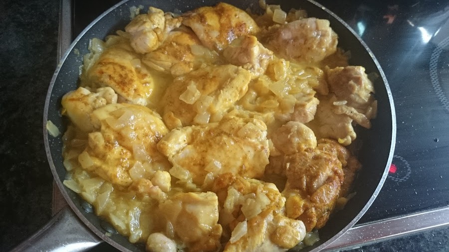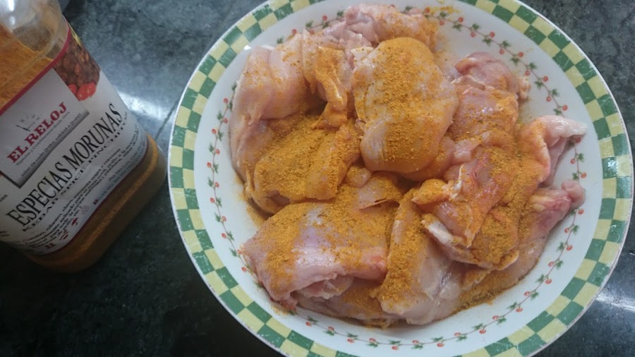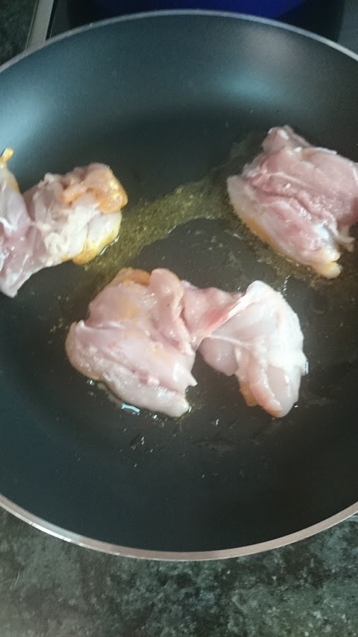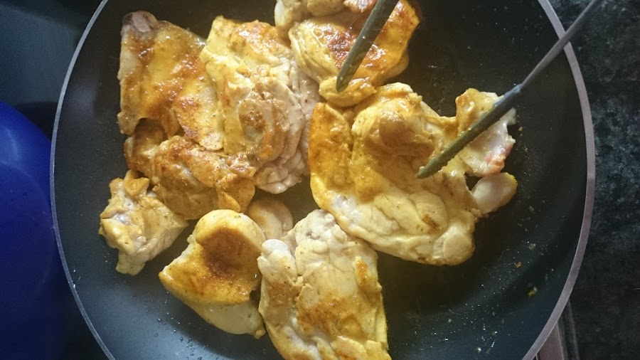 3.- Aliñamos el pollo con las especias y lo sellamos en una sarten con un poco de aceite.