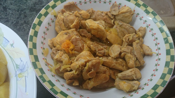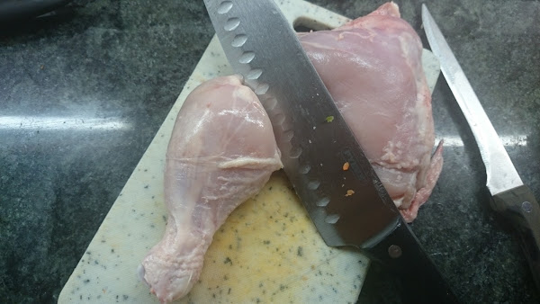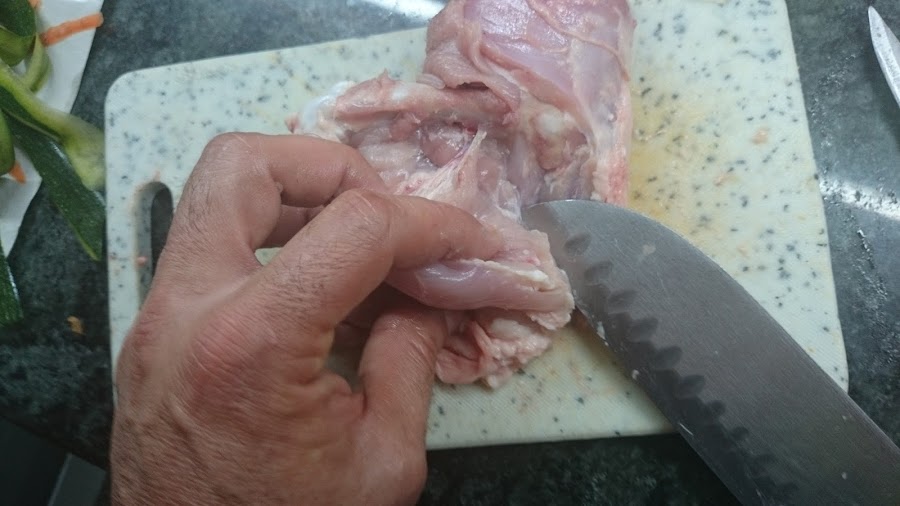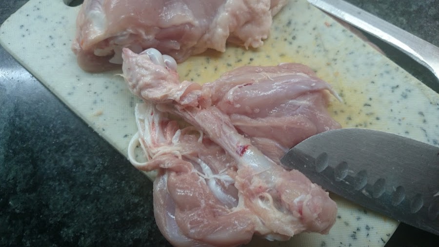 2.- Quitamos la piel y los huesos al pollo y lo reservamos.