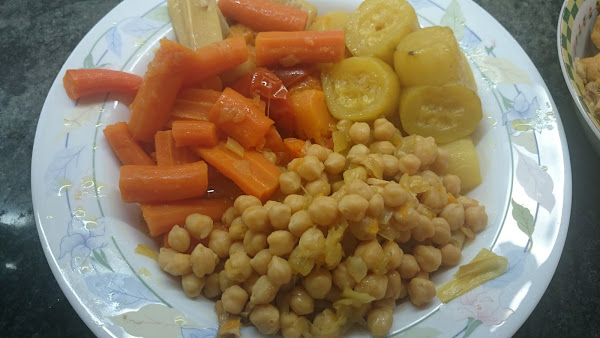 13.- Emplatamos poniendo por separado Cous-Cous, verduras, carne y garbanzos. El caldo caliente aparte.