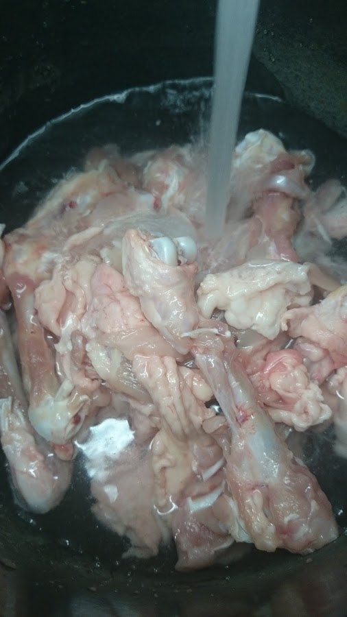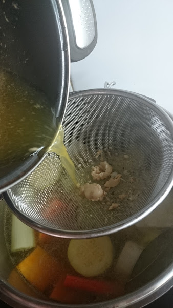 5.- Mientras en una olla pequeña hacemos un fumet con los huesos y la piel del pollo y un poco de sal y especias.