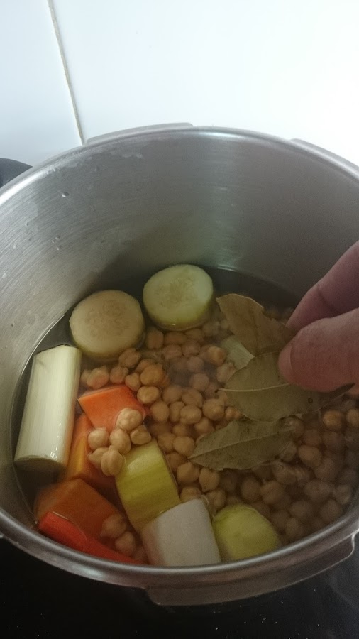 6.- En la olla expres ponemos la verdura con los garbanzos y un poco de agua.