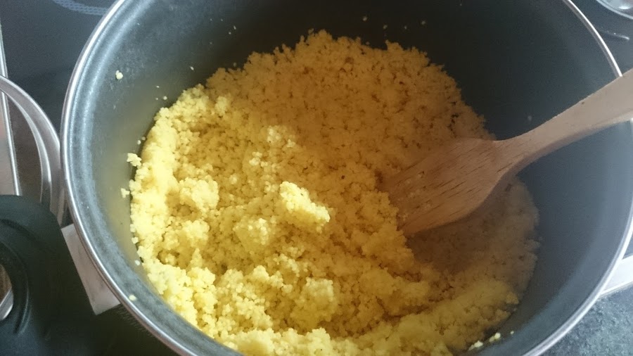 11.- Mientras hacemos el Cous-Cous siguiendo las intrucciones de la marca. Normalmente se derrite mantequilla se agrega el cous-cous y se morea un poco, se retira del fuego, se le echa el agua hirviendo y se deja reposar de 5 a 10 minutos hasta que haya absorvido el agua.