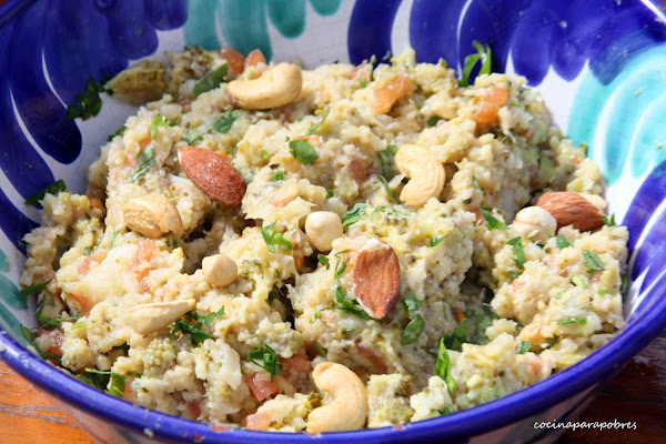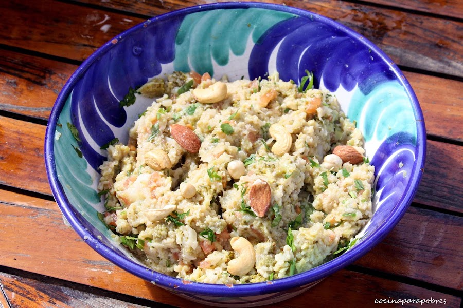 Quitamos la piel del tomate, lo cortamos a dados pequeños; majamos un puñado de frutos secos, picamos el perejil, incorporamos todo a la fuente, aliñamos con aceite, sal y zumo de limón. Servimos bien fresquito con frutos secos enteros.