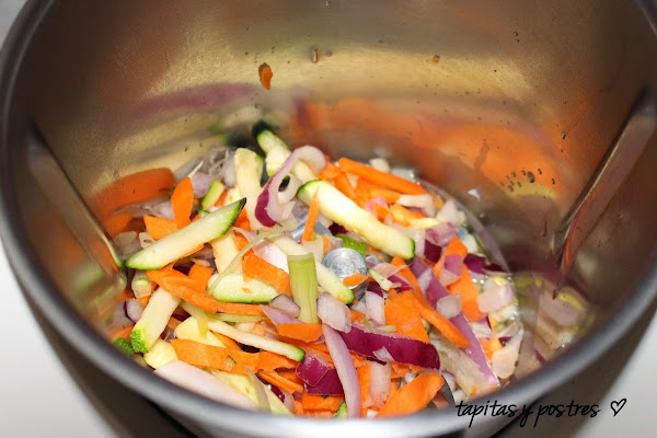 Agregamos la media bolsa de verduras y sofreímos cinco minutos, 100º, velocidad 1.