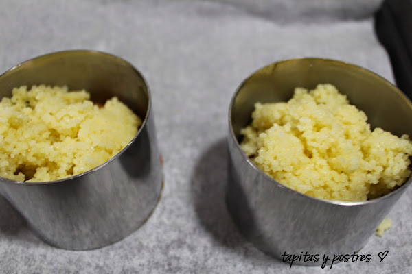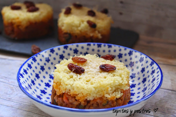 En una bandeja de horno forrada con papel vegetal, colocamos tres aros de emplatar. Colocamos dentro una cucharada generosa del relleno de verduras y carne, encima una cucharada de cous cous y aplastamos.