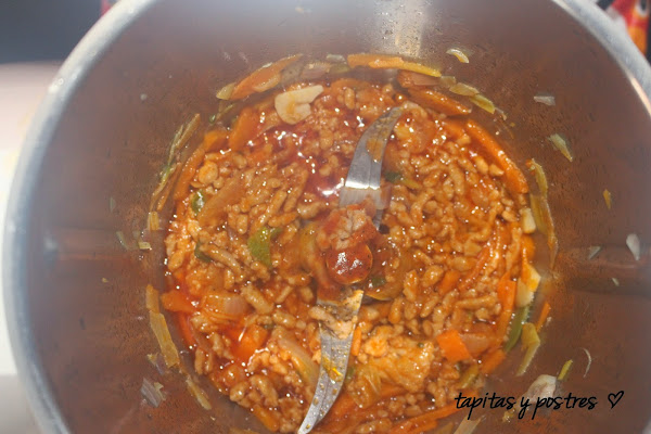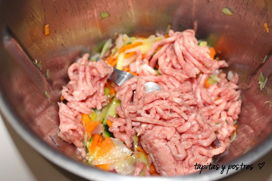 Si queremos prepararlo sin thermomix, pochamos las verduras con el ajo y el aceite en una sartén antiadherente. Cuando estén bien pochadas, añadimos la carne y rehogamos. Una vez que la carne esté hecha, agregamos el tomate, la sal y la pimienta y cocemos unos minutos. El resto es igual que os he explicado más arriba.