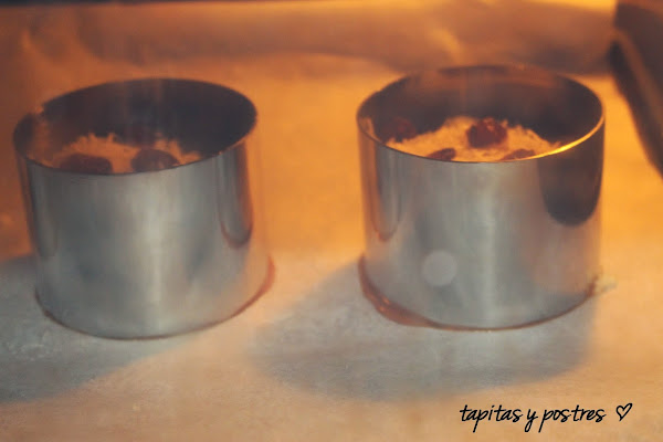 Retiramos del horno y con una espátula cogemos todo el aro y lo colocamos en el plato donde lo vayamos a servir. Pasamos un cuchillo por el interior y levantamos el aro despacio.