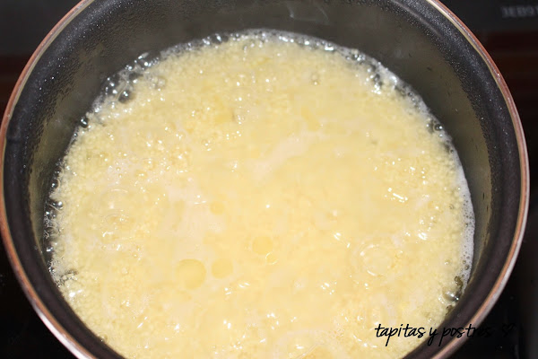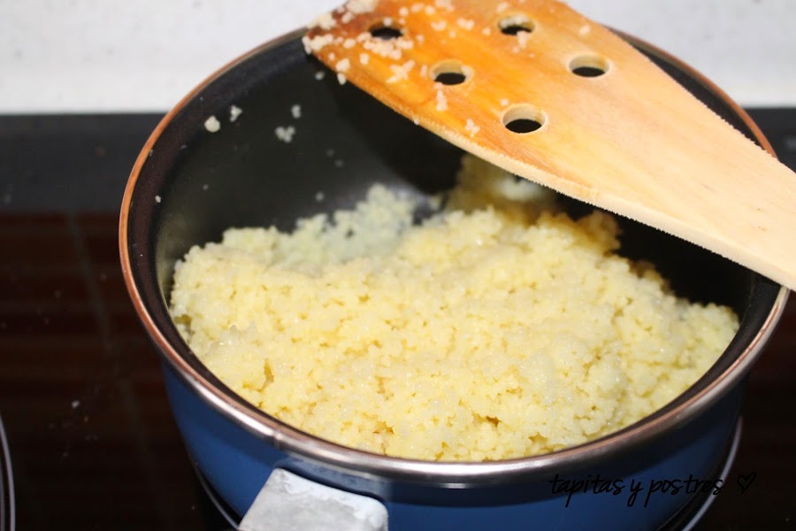Reservamos, mientras preparamos el cous cous según las instrucciones del fabricante. En mi caso, llevar a ebullición un vaso de agua con una pizca de sal. Cuando hierva, echar 100 gr de cous cous remover y apartar del fuego.