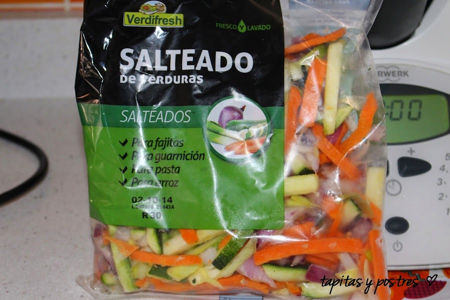 Podéis usar las verduras que más os gusten, yo he usado estas bolsas de salteado de verduras que vienen cortadas y surtidas.