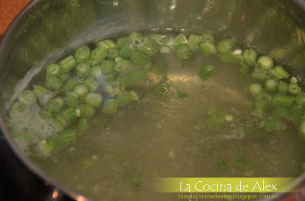 Cortamos las judías y tacos y las cocemos en el mismo agua de la coliflor durante 4-5 minutos hasta que este tierna. Reservamos.