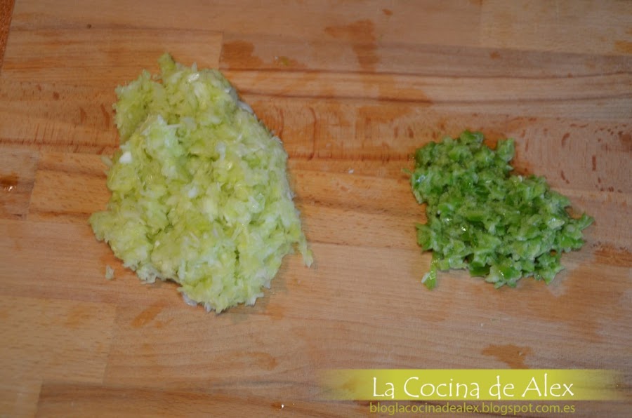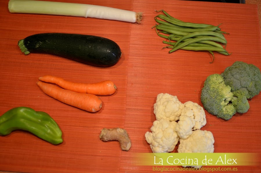 PREPARACIÓN:Lo primero que hacemos es cortar las verduras, la cebolla y el pimiento lo mas pequeño posible y la berenjena (sin pelar) y las zanahorias y tacos mas o menos del mismo tamaño.