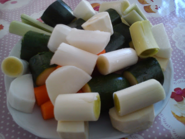 Verdura: 2 calabacines (si los encuentro me gusta comprarlos blancos, si no verdes), 1 repollo, 2 zanahorias, 2 chirivías, 2 nabos, 2 puerros y 1 tallo de apio.