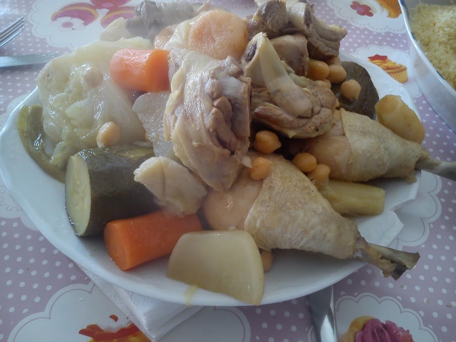 Es como un cocido pero con otro tipo de verduras y carnes, también lleva unas especias que yo compro en el mercado, es una bolsita de especias especiales para cous-cous.