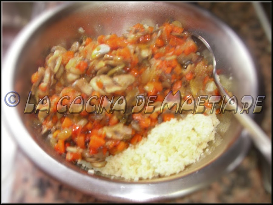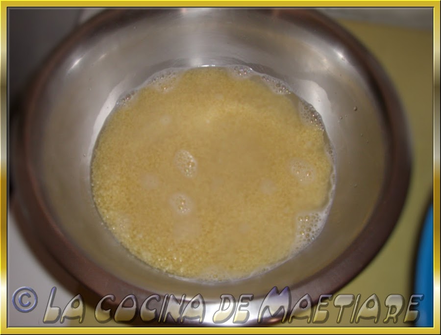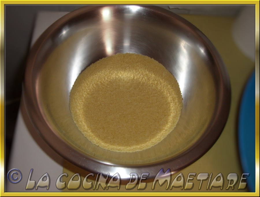 Calentar el agua hasta el punto de ebullición ( yo lo he hecho en el microondas ). Echar el agua sobre el couscous.