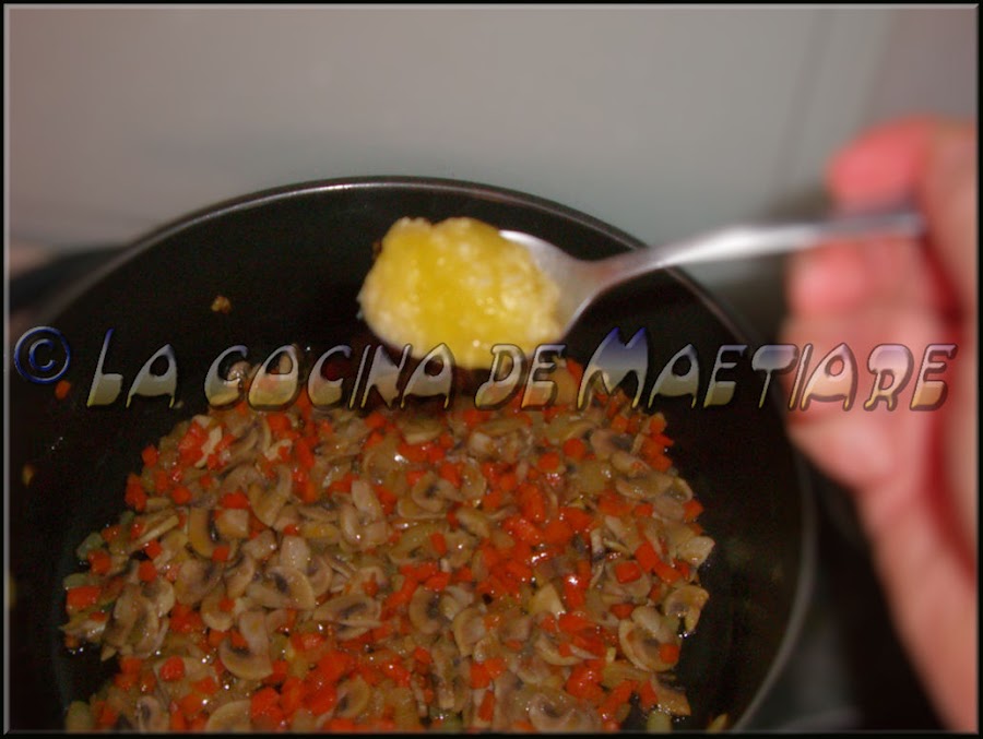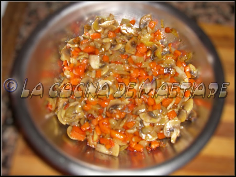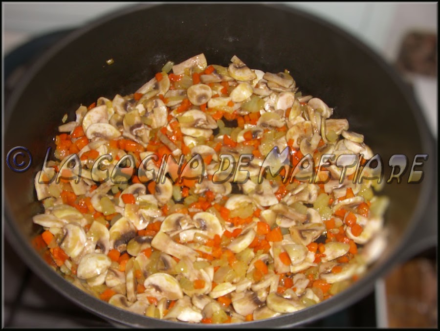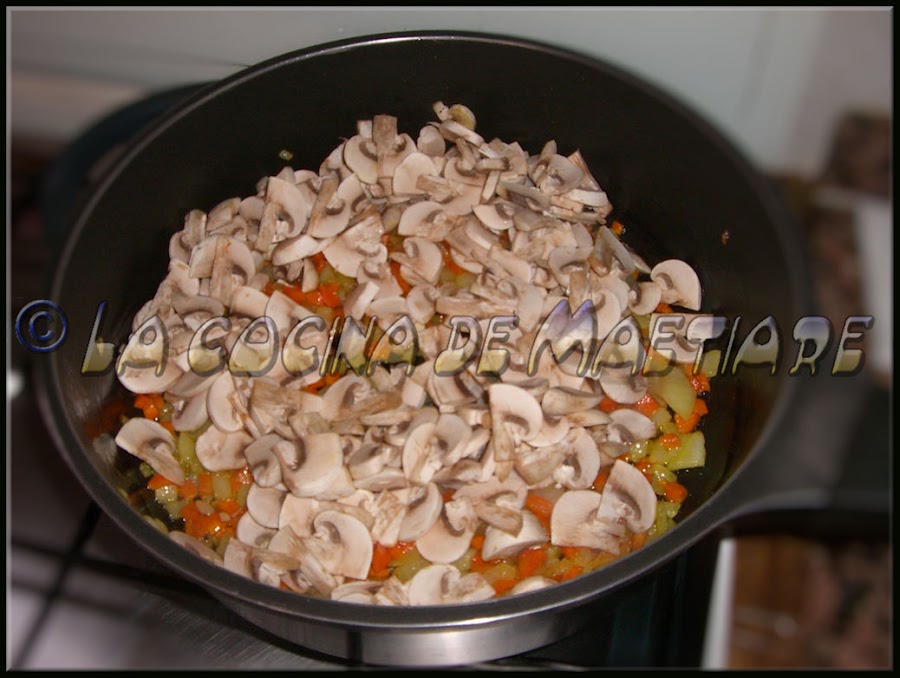Cuando la cebolla cuando comience a transparentar y la zanahoria esté ya tierna, añadir los champiñones que habremos limpiado y laminado.