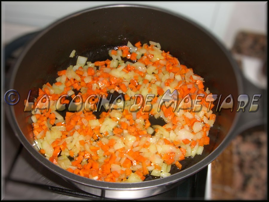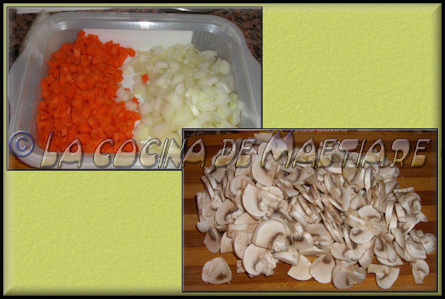 Pelamos cebolla, zanahoria y ajos. Picar fino los ajos. Picar en brunoise fina cebolla y zanahoria. Cortar en laminas los champiñones.