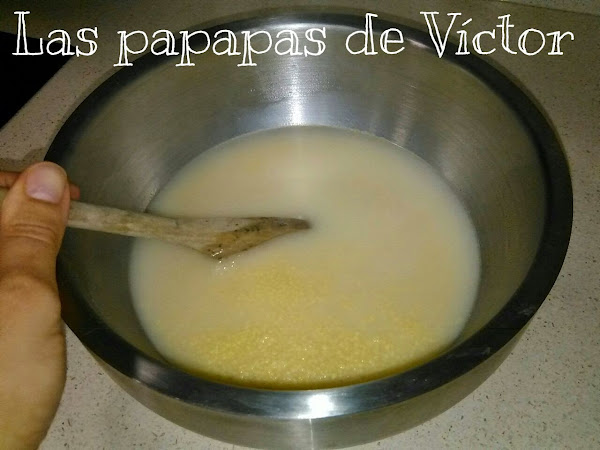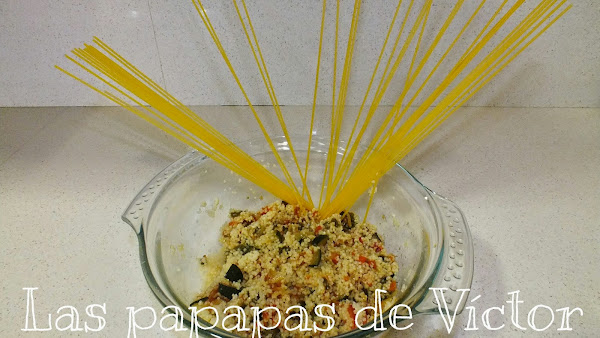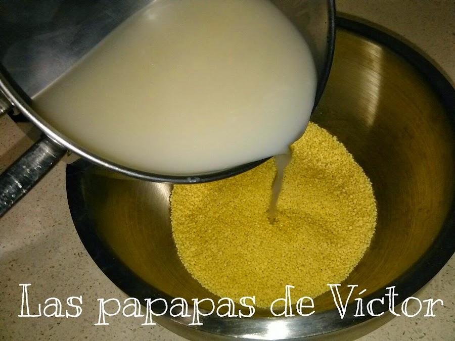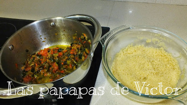En un bol alto Poner el cuscús con el caldo de verduras y Un chorrito de aceite o Una pizca de mantequilla