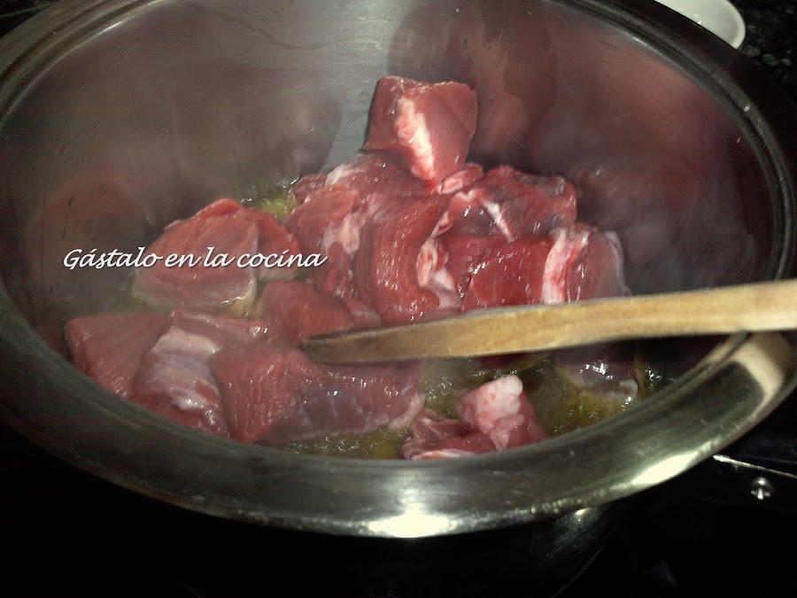 Ponemos en una olla grande aceite que cubra el fondo y echamos la carne que se dore.