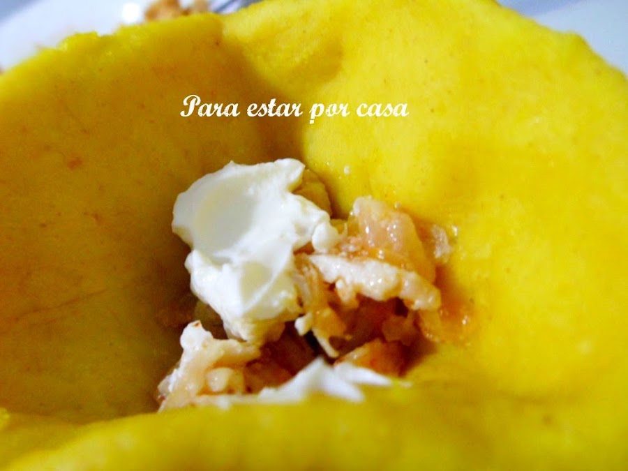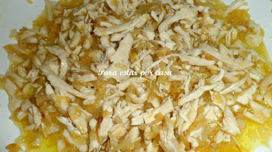 Añadiremos después el pollo y dos cucharadas soperas de queso de untar. Cuando este todo bien mezclado, retiraremos del fuego y añadiremos una cucharada de pimentón dulce.